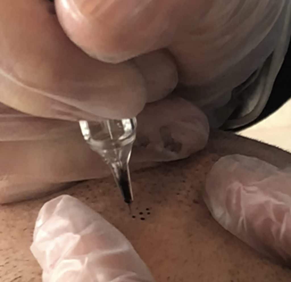 The best way to understand scalp micropigmentation is to think of it as a scalp tattoo. Like a tattoo a handheld machine is used to pierce the skin numerous times whilst implanting pigment into the skin. The only differences are scalp micropigmentation is not implanted as deep into the skin as traditional tattooing is and the pigment is cosmetic and made of natural components, this is different as tattoo ink is much more concentrated and has more of a metal base.